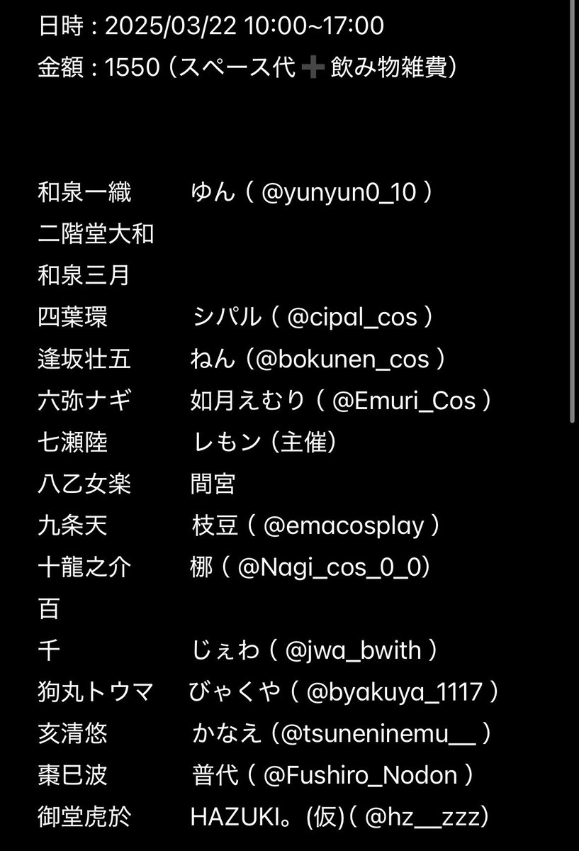 レもン@sara__cos・Mar 21RT @sara__cos: ほんとに前日なのであれなんですが、、、全員ちゃんと集めたくて、、、2️⃣3️⃣🍑空いてしまって明日来れる方いませんか、、、、、もし興味ある方リプでもDMでも大丈夫ですので…