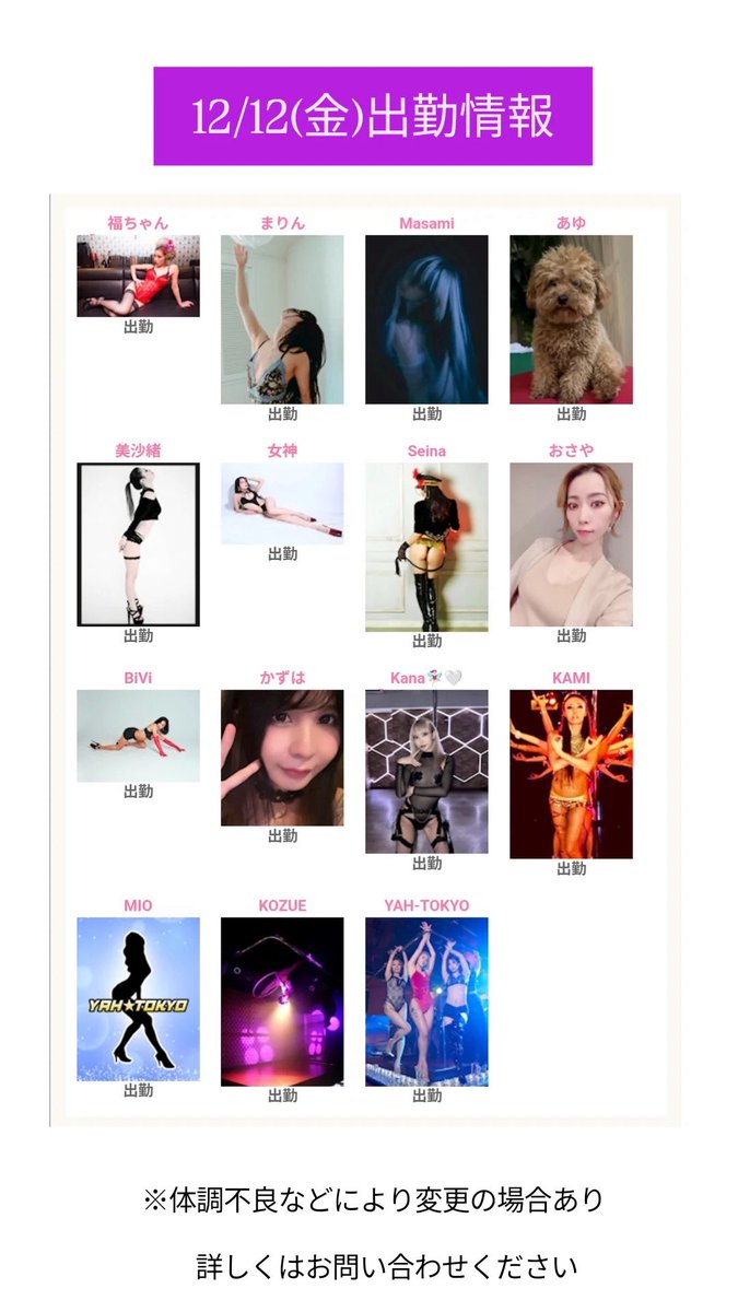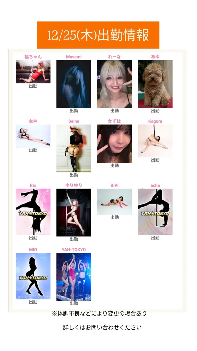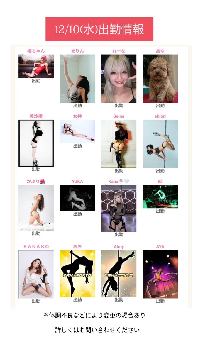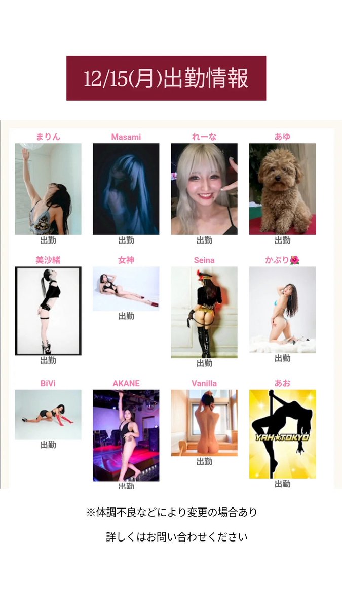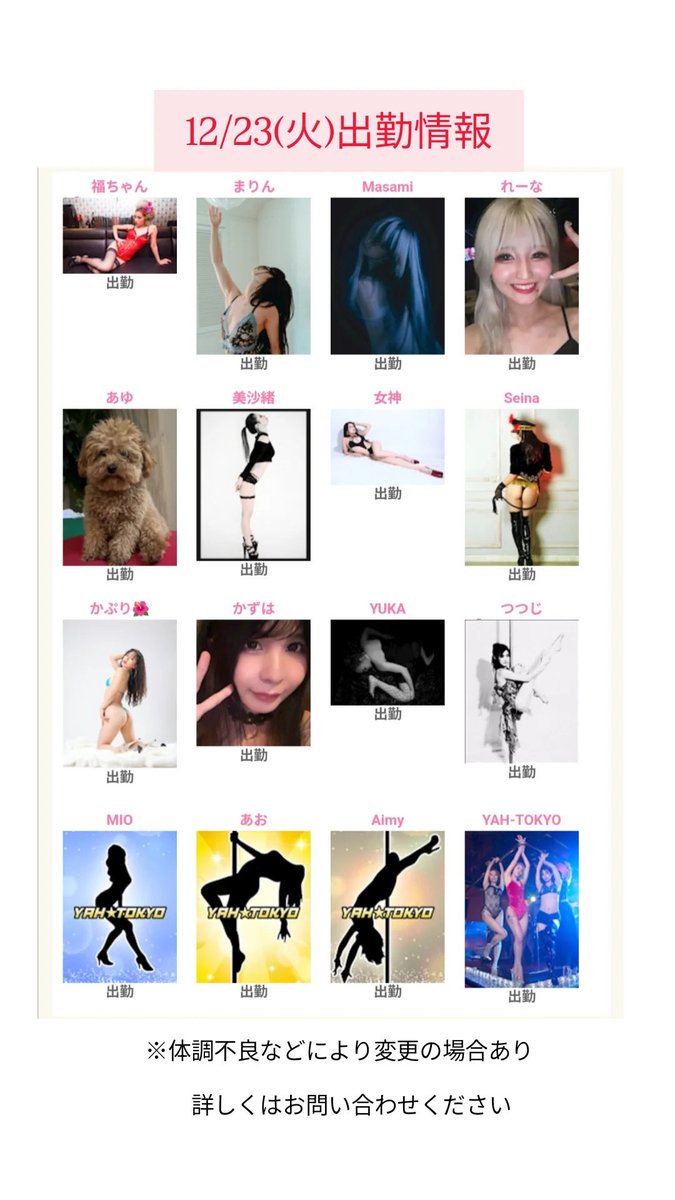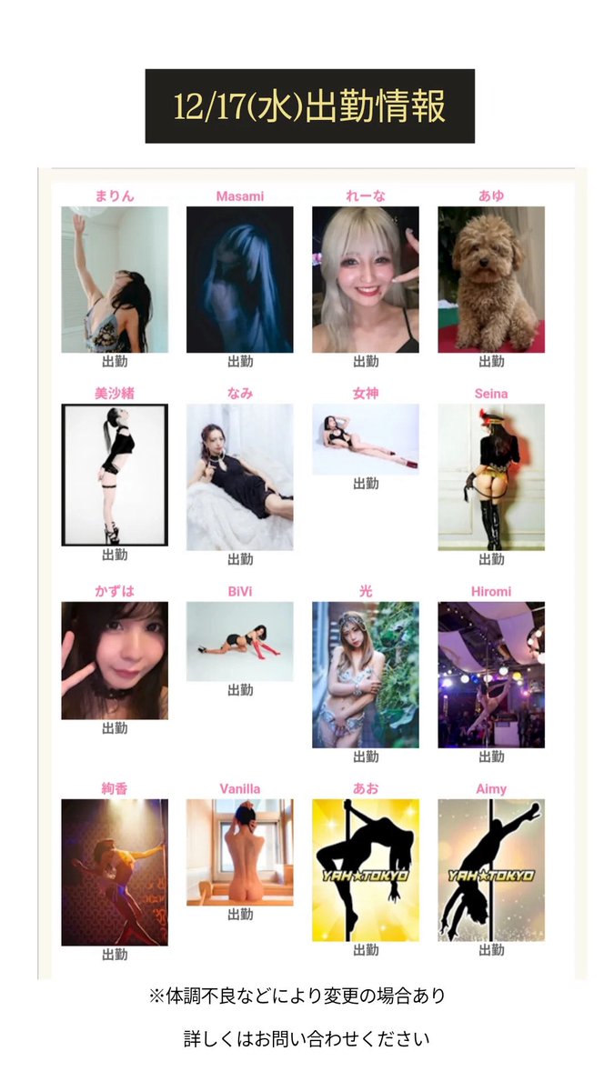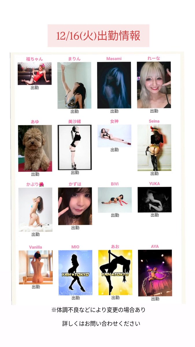 - 銀座YAH☆TOKYO【公式】@yahtokyo_ginza・Dec 11本日の出勤情報 https://t.co/tTX0Qu1jY0