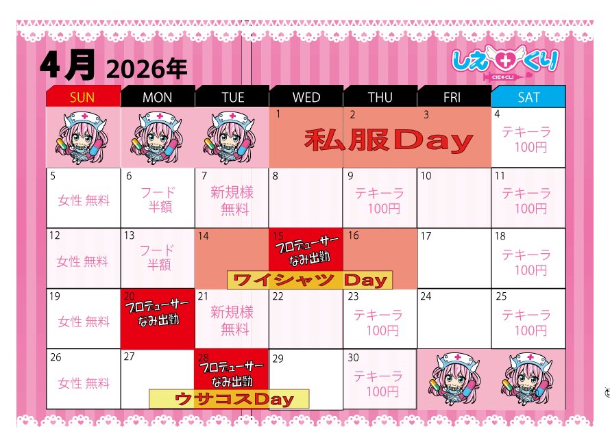 しえ♡くり❤️🔥某有名女優プロデュースのコンカフェ❤️🔥 【新宿歌舞伎町】@cieloclinic_kab・Mar 30˙˚ʚ 4月カレンダー🌸 ɞ˚˙