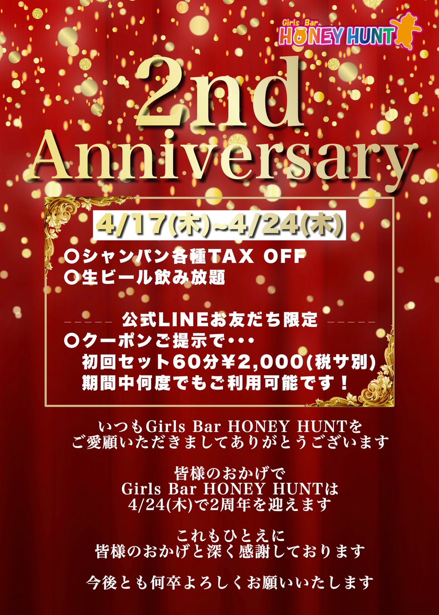 上野 Girls Bar HONEY HUNT@HONEYHUNT2023・Apr 17HONEY HUNTは、4/24(木)で2周年を迎えます!